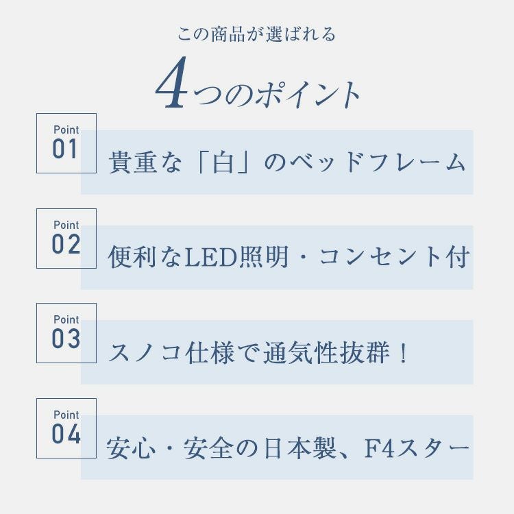 他の画像を見る 女性や子どもに人気の、木目を活かした白いベッドフレーム。かわいいと評判です。便利なLED照明とコンセント付きで、通気性も抜群。掃除もしやすい日本製ベッドです。 【組立設置込み】フランスベッド ベッドフレーム PSC-194 脚付 シングル | LED照明 コンセント付 スノコ仕様 日本製 F4スター フレームのみ フランスベッド公式パートナーショップ 3%オフ対象商品 販売価格 ¥ 64,800 税込 詳細を見る お気に入りに登録する