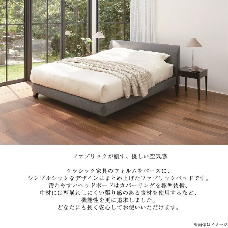 【デザイン】クラシック家具のフォルムをベースに、シンプルでシックにデザインにまとめあげたファブリックベッドです。【色】通常:グレー色受注生産:モカブラウン色、スモーキーピンク色、アイボリー色の4色展開となっています。(脚は1色)【脚付き】脚付きタイプのため、・通気性抜群・圧迫感を与えない・お掃除がしやすい というメリットがあります。【カバーリング】ヘッドボードのカバーは取り外してドライクリーニングが可能です。別売でヘッドボードカバーの販売も行っております。【配送方法】フレームの搬入は大変です。当店では寝室まで搬入し、組立て・設置、梱包材の回収まで行わせて頂きます。お客様は設置場所をご指示頂くだけの「ラクラク配送」となります。※フレーム単品での販売です。マットレス、ナイトーブル、 寝装品等は別売となります。