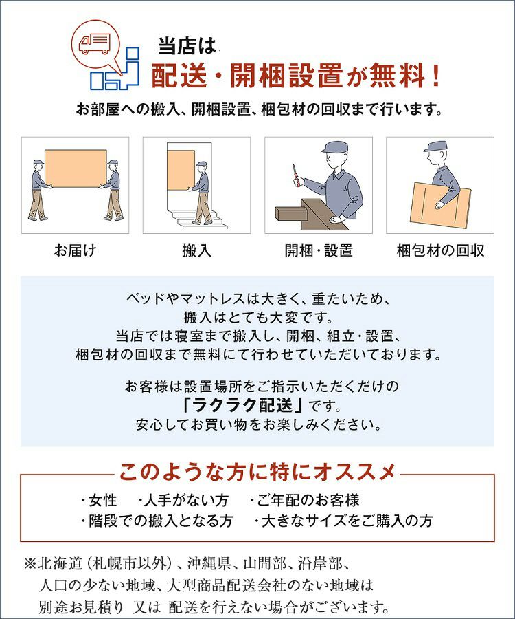 配送方法 寝室への搬入、組み立て、設置、梱包材の回収まで行わせていただきます。
