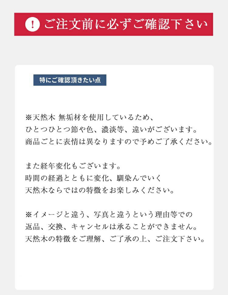 天然木は 節や色、濃淡等、一つとして同じ柄がなく、表情は異なります