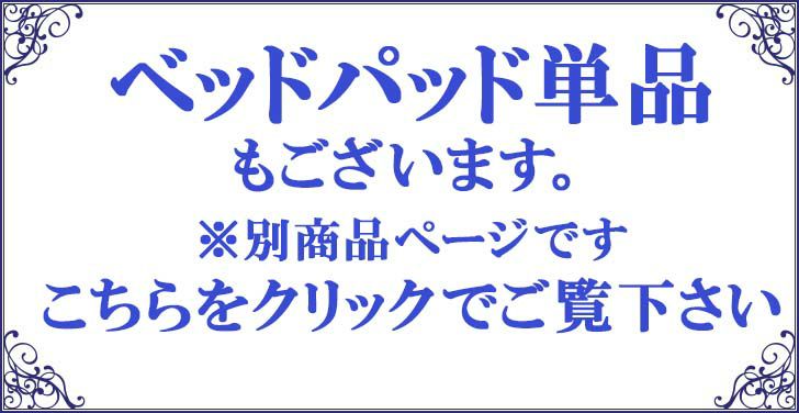 | ベッドパッド | 商品名:ベーシックパッド 表布地:ポリエステル65%、綿35% 中わた:ポリエステル100%(抗菌・防臭・防カビ加工) 生産 :日本製 |