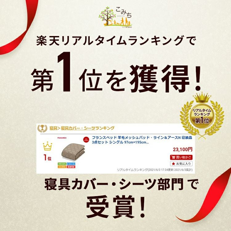 ~ベッドパッド~快適な睡眠環境を整えることを追求したフランスベッドの羊毛ベッドパッドです。【オールシーズン仕様】冬は保温性に優れた「羊毛」面、夏はサラッと快適な「メッシュ」面をお使い頂ける、オールシーズン仕様です。【羊毛】吸湿発散性・保温性に優れ、寝具として最適な素材と言われる「羊毛」を使用しています※保温効果が高く、弾力性がある英国産 ヒルラドナー種羊毛100%使用。【メッシュ】サラッと快適な「メッシュ」にしています。暑い夏もベタつかず、快適にお使い頂けます。【洗濯可能】羊毛でも洗濯が可能です。※4角滑り止めゴム付き~マットレスカバー~定番マットレスカバー「ライン&アースN」をセットにしています。柔らかい肌触り、ストライプのデザインが特長です。【綿】綿100%を使用しています。【抗菌防臭加工】安心の抗菌防臭加工済みのため、衛生面でも安心してお使い頂けます。【カラー】ホワイト、ネイビー、ベージュ、チャコールグレーの4色からお選び頂けます。【対応】マット厚30cmまで対応しています。【当店について】当店はお客様へのご案内、販売が優良であるとフランスベッドが認定した、「フランスベッド公式パートナーショップ」です。安心してベッド選びをお楽しみください。株式会社こみち代表取締役社長 入江慎介