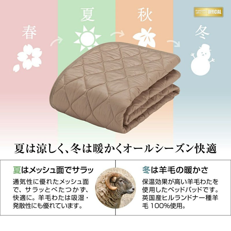 ~ベッドパッド~快適な睡眠環境を整えることを追求したフランスベッドの羊毛ベッドパッドです。【オールシーズン仕様】冬は保温性に優れた「羊毛」面、夏はサラッと快適な「メッシュ」面をお使い頂ける、オールシーズン仕様です。【羊毛】吸湿発散性・保温性に優れ、寝具として最適な素材と言われる「羊毛」を使用しています※保温効果が高く、弾力性がある英国産 ヒルラドナー種羊毛100%使用。【メッシュ】サラッと快適な「メッシュ」にしています。暑い夏もベタつかず、快適にお使い頂けます。【洗濯可能】羊毛でも洗濯が可能です。※4角滑り止めゴム付き~マットレスカバー~定番マットレスカバー「エッフェスタンダード」をセットにしています。【綿100%】丈夫な100%コットンを使用しています。【抗菌防臭加工】抗菌防臭加工が施されているため、衛生面でも安心してお使い頂けます。【カラー】キナリ、ベージュの2色からお選び頂けます。【対応】マット厚30cmまで対応しています。【当店について】当店はお客様へのご案内、販売が優良であるとフランスベッドが認定した、「フランスベッド公式パートナーショップ」です。安心してベッド選びをお楽しみください。株式会社こみち代表取締役社長 入江慎介