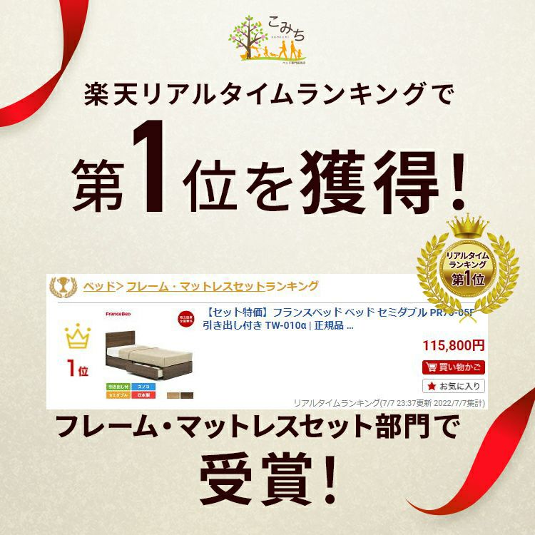 他の画像を見る コスパ抜群 フランスベッド ベッド | フランスベッド製 マットレス付き ベット マットレス 付き マットレスセット 70周年 収納 収納付き 引き出し 引出し スノコ すのこ すのこベッド 【セット特価】フランスベッド ベッド セミダブル PR70-05F 引き出し付き TW-010α | 正規品 フランスベッド製 セミダブルベッド マットレス付き マットレスセット ベッドセット マットレス付 ベット セミダブルサイズ 収納 収納付き すのこ スノコ コンパクト 日本製 3%オフ対象商品 販売価格 ¥ 139,800 税込 詳細を見る お気に入りに登録する