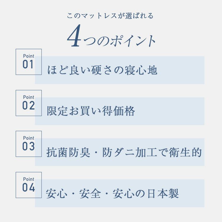 他の画像を見る 階段が狭い、エレベーターが小さい等、搬入難しいに特にオススメ!圧縮梱包だから搬入もしやすい!腰をしっかりと支えてくれるスプリングマットレス フランスベッド マットレス ポルテ R-ZERO-300 | 正規品 フランスベッド製 POLUTE 圧縮梱包 ベッド マットレス ベッドマットレス シングル セミダブル ダブル シングルベッド セミダブルベッド ダブルベッド 抗菌 防臭 防ダニ シングルマットレス ダブルマットレス 5%オフ対象商品 販売価格 ¥ 49,800 税込 〜 販売価格 ¥ 税込 詳細を見る お気に入りに登録する