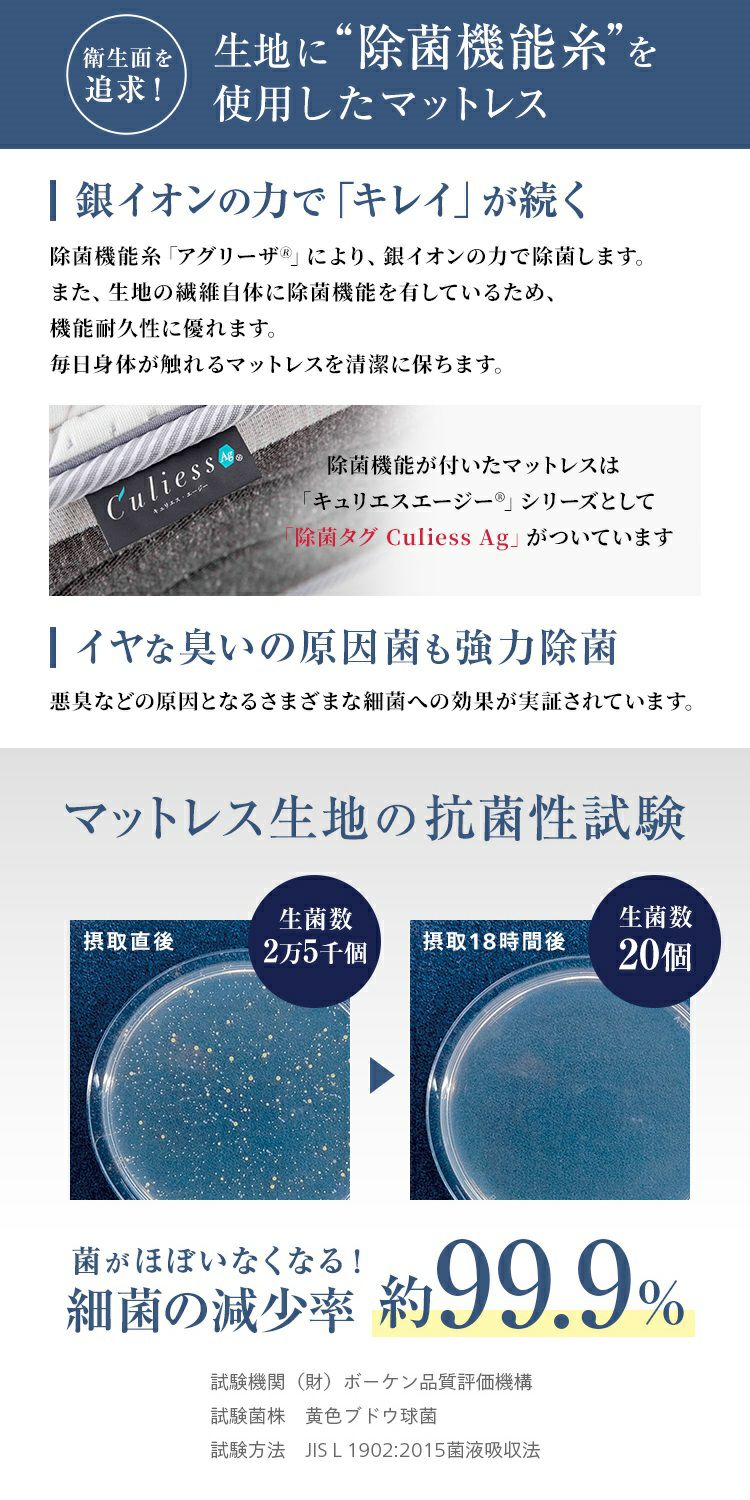 | 仕様 | プロウォール、除菌機能(キュリエスエージー) 抗菌防臭防ダニ加工・ブレスエアーエクストラ ※片面仕様(両面使えますが、仕様が異なるため寝心地が異なります) |