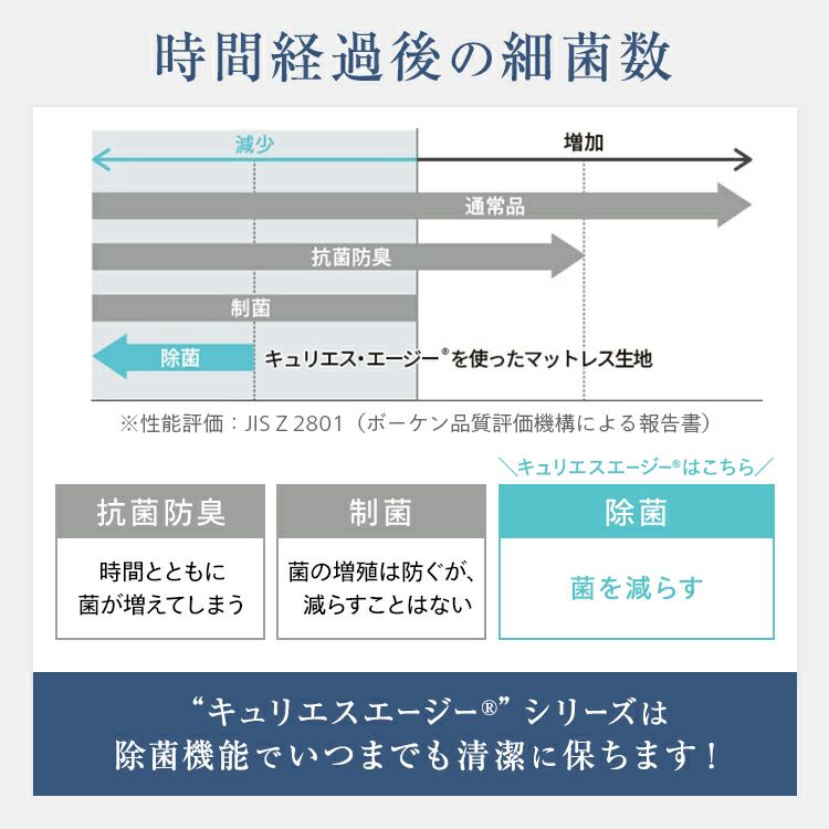 | 仕様 | プロウォール、除菌機能(キュリエスエージー) 抗菌防臭防ダニ加工・ブレスエアーエクストラ ※片面仕様(両面使えますが、仕様が異なるため寝心地が異なります) |