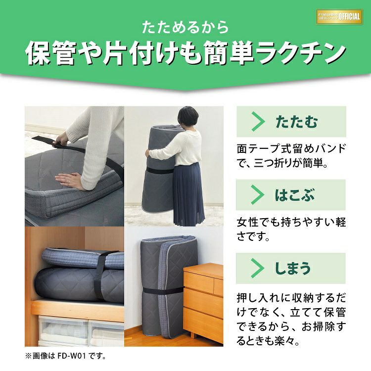 他の画像を見る 来客用に便利な 折りたたみマットレス | フランスベッド製マットレス フォールドエアー 薄い 薄型 来客用 三つ折り 折り畳み 折りたたみ 折りたためる 厚さ12cm フランスベッド マットレス FD-W02 | 正規品 フランスベッド フォールドエアー ベッド マットレス 圧縮梱包 薄い 薄型 来客用 三つ折り 折り畳み 折りたたみ 折りたためる 固め かため 硬い 折りたたみマットレス 厚さ12cm 一人暮らし シングル セミダブル ダブル 5%オフ対象商品 販売価格 ¥ 43,800 税込 〜 販売価格 ¥ 税込 詳細を見る お気に入りに登録する