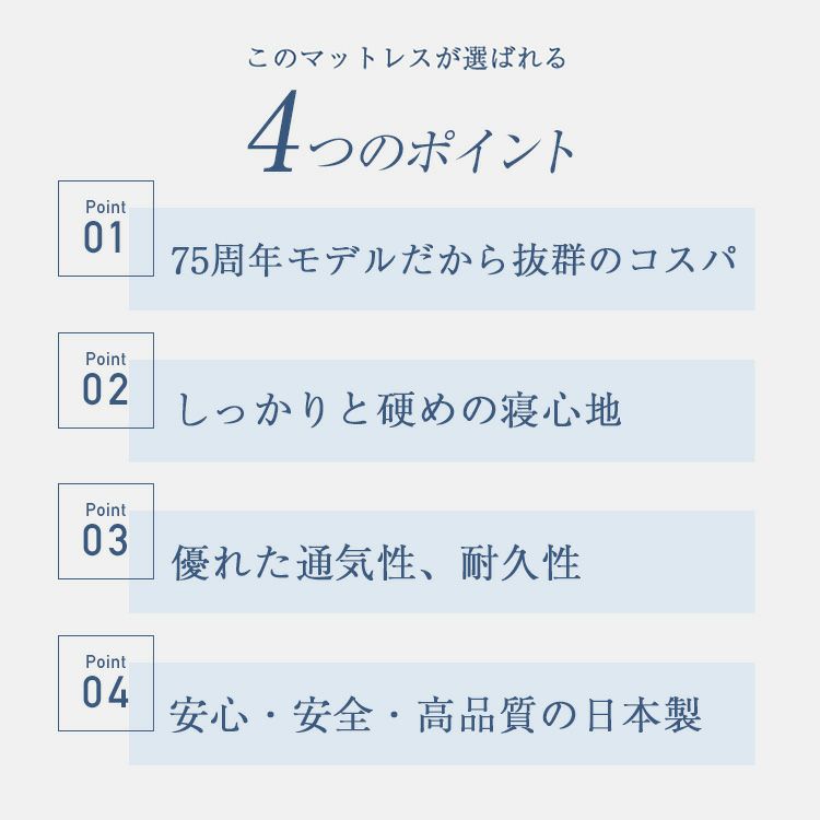 他の画像を見る 75周年モデルだから抜群のコスパ!腰痛持ちでお悩みの方にオススメ、しっかりと硬めのマットレス 新作 フランスベッド マットレス AN-PRE | 正規品 75周年モデル フランスベッド製 ベッド ベッドマットレス 硬め 腰痛 マルチラスハード 防ダニ 高密度連続スプリング シングル セミダブル ダブル 7%オフ対象商品 販売価格 ¥ 66,000 税込 〜 販売価格 ¥ 税込 詳細を見る お気に入りに登録する