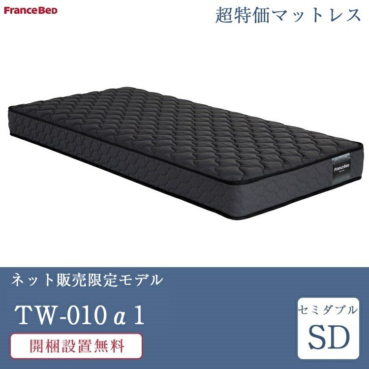 TW-010α1はお客様へのご案内が優良とされた数店舗のみが取り扱えるカタログにも掲載されていない特別お買い得マットレスです。フランスベッド最安値モデルとなります。【スプリング】フランスベッドの高密度連続スプリング「ツインサポートスプリング」を使用しています。通気性、耐久性に優れ、腰をしっかりと支えてくれるスプリングです。【寝心地】しっかりとした硬さがあり、しっかりと腰を支えてくれます。硬い寝心地が好きな方、成長期のお子様、布団派だった方に人気です。【このような方にオススメ】・しっかりとした硬さのある寝心地がお好みの方・ご予算を抑えつつ、フランスベッドの寝心地を楽しみたい方・薄いマットレス、軽いマットレスをお探しの方【両面仕様】TW-010α1は両面仕様となっているため、良い寝心地をより長く楽しむことができます。【安心・安全】TW-010α1には防ダニ・抗菌防臭加工が施されています。【日本製】安心・安全・高品質の日本製です。フランスベッドの熟練の職人さんが厳しい目で丁寧に作り上げています。【配送方法】マットレスの搬入は大変です。当店では寝室まで搬入し、開梱・設置、梱包材の回収まで行わせて頂きます。お客様は設置場所をご指示頂くだけの「ラクラク配送」となります。【メーカー保証】お届け日より2年間となります。【納期】取り寄せ:通常6~10営業日で発送※人気商品のため、お届けの目安と異なり、お届けまでお日にちを頂く場合がございます※ご注文のタイミング、お届け先により納期は異なります詳しくはご注文後、メーカーより納期回答がありましたらお届け日の打ち合わせを行わせて頂いております【当店について】当店はお客様へのご案内、販売が優良であるとフランスベッドに認定された「公式パートナーショップ」です。安心してベッド選びをお楽しみください。ベッド専門販売店こみち代表取締役社長・入江慎介