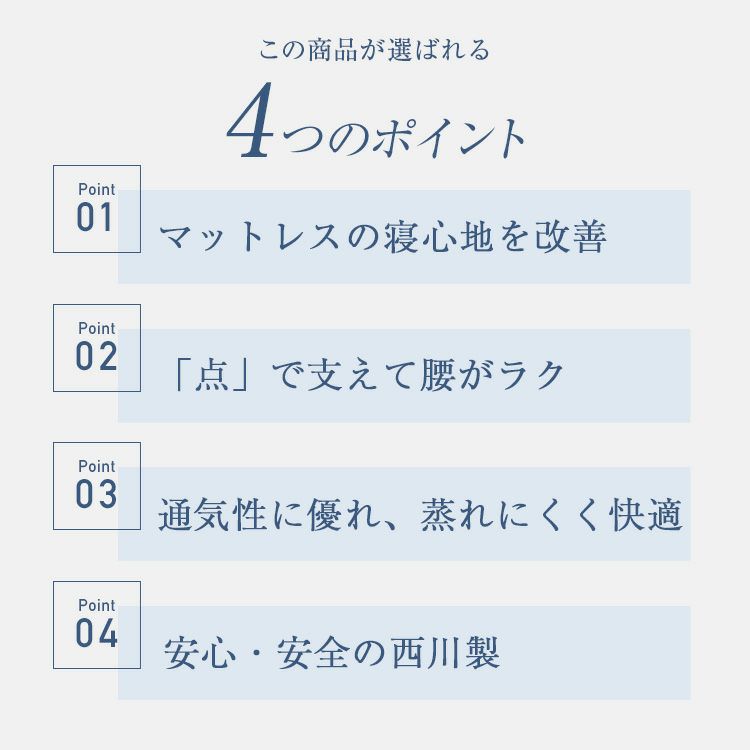 他の画像を見る ベッドの寝心地を改善、「点」で支えるトッパー | 西川 睡眠ラボ ヘルシーライトマットレス トッパー マットレストッパー マットレス トッパー 西川 マットレストッパー Dots ヘルシーライトマットレス | 正規品 マットレス トッパー 西川製 nishikawa 西川 睡眠labo 西川 睡眠ラボ ドッツ 西川 睡眠 ヘルシーライト シングル セミダブル ダブル 5%オフ対象商品 販売価格 ¥ 18,150 税込 〜 販売価格 ¥ 税込 詳細を見る お気に入りに登録する