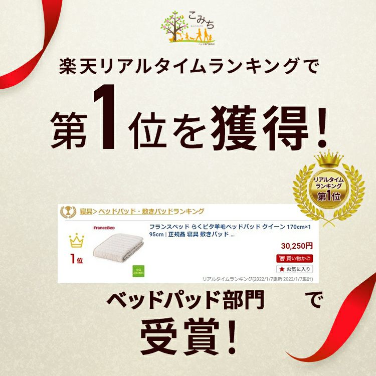 「ベッドのメーキングって大変」というお客様の声にお応えするため開発された「ベッドの上に置くだけ」という画期的なベッドパッドです。【ずれない!】一般的なベッドパッドはマットレスからズレないようにゴムを巻き込んで利用するのですが、これが意外に面倒で、特にご年配の方にとっては重労働となっていました。らくピタ羊毛ベッドパッドはゴムがなくても敷くだけでズレにくい、とても便利なベッドパッドです。【羊毛】吸湿・発散性、保温性に優れる羊毛100%を詰め物に使用、快適な睡眠環境を生み出してくれます。【洗濯可能】ご自宅でも洗濯が可能です。※洗濯ネット付き【当店について】当店はお客様へのご案内、販売が優良であるとフランスベッドに認定された「公式パートナーショップ」です。安心してベッド選びをお楽しみください。ベッド専門販売店こみち代表取締役社長・睡眠改善インストラクター入江慎介