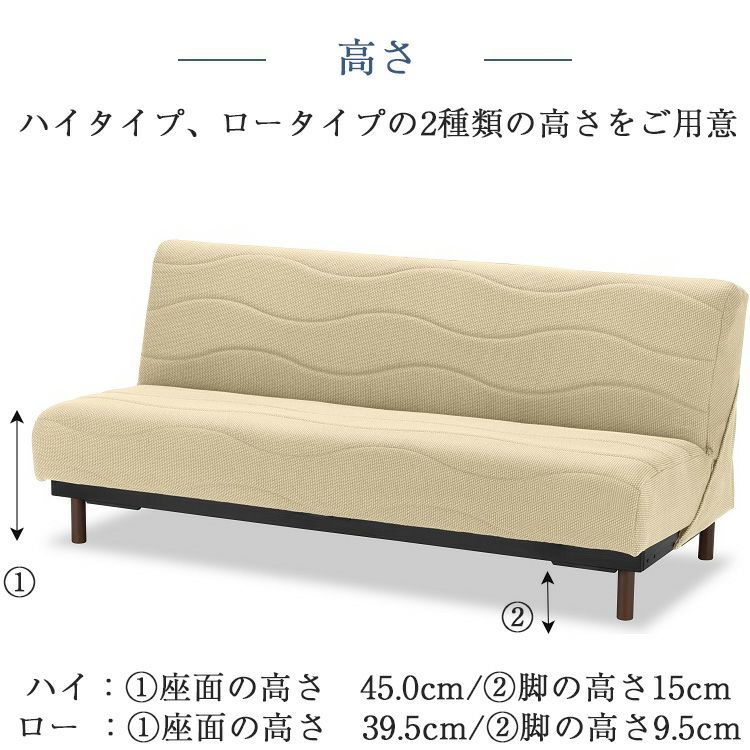 | サイズ | ロー:横幅170cm×奥行92cm~110cm×高さ78.5cm×座面高さ39.5cm (脚の高さ9.5cm) ハイ:横幅170cm×奥行92cm~110cm×高さ84cm×座面高さ45cm (脚の高さ15cm)