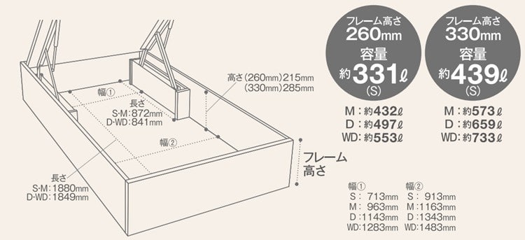 ・ロングサイズ、跳ね上げ収納、ホテル仕様は長さが若干異なります