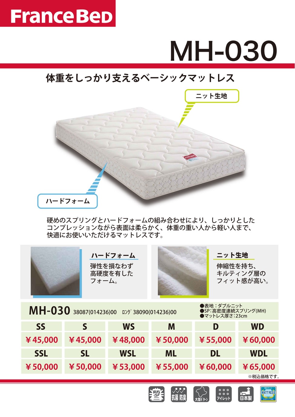 MH‐030は、全日本ベッド工業会認定の「衛生マットレス」です。
