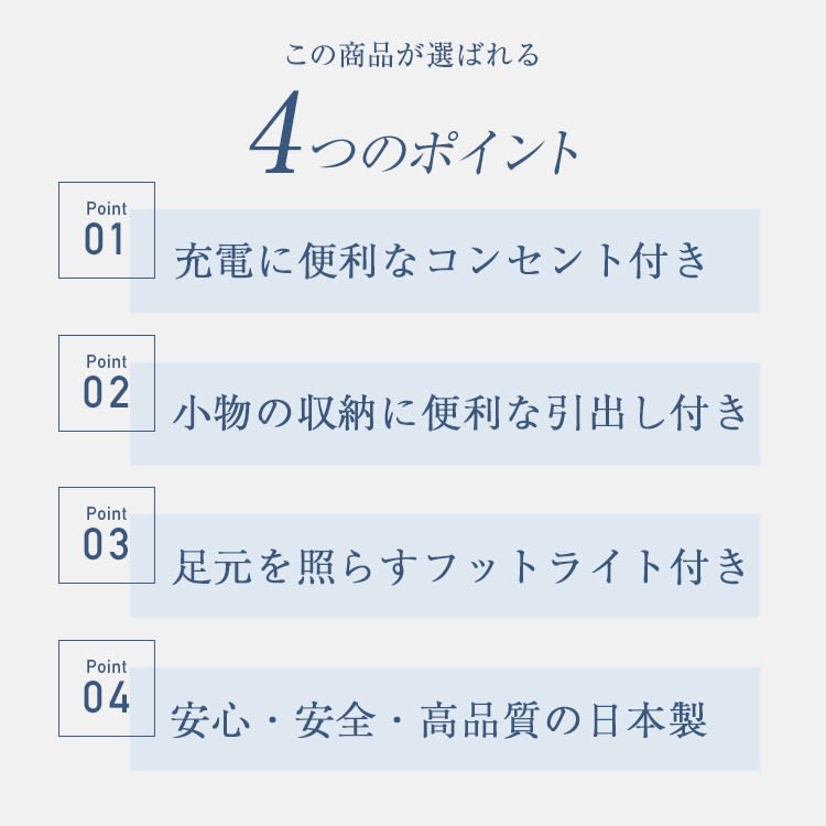 便利なコンセント付き、引き出し付き、フットライト付きの