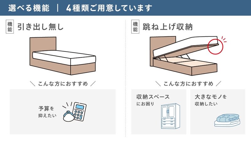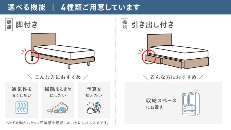 脚付き、引き出し付き、引き出し無し、跳ね上げ収納タイプ