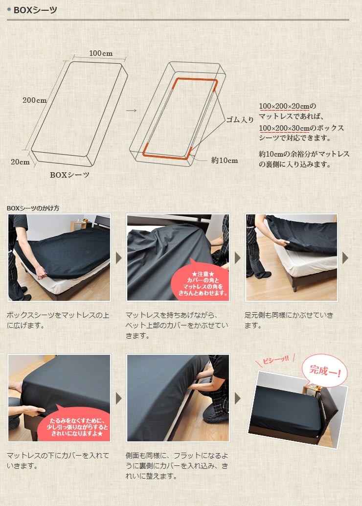 シングル:100cm×200cm×30cm/セミダブル:120cm×200cm×30cm/ダブル:140cm×200cm×30cm/ワイドダブル:155cm×200cm×30cm/クイーン:160cm×200cm×30cm/キング:180cm×200cm×30cm