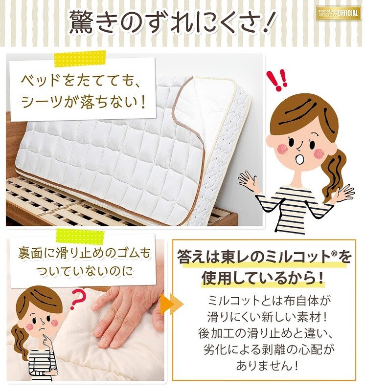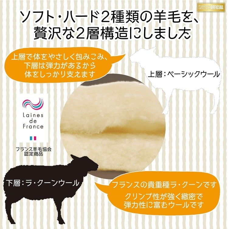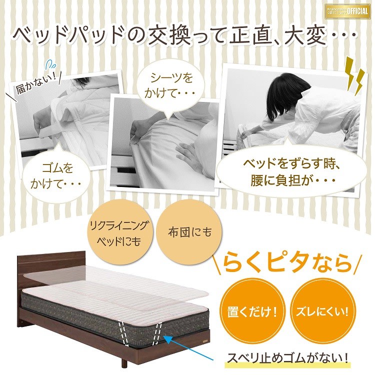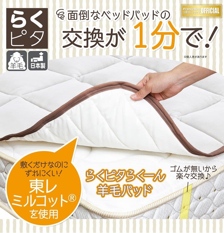 関連ワード:フランスベッド フランスベット 寝具 ベッドパッド ベッドパット 敷きパッド 羊毛 ウール 日本製 国産 らくぴた らくピタ