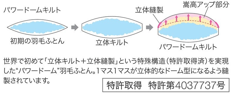 羽毛布団の生地を膨らみやすくする、世界で初めての特殊な構造