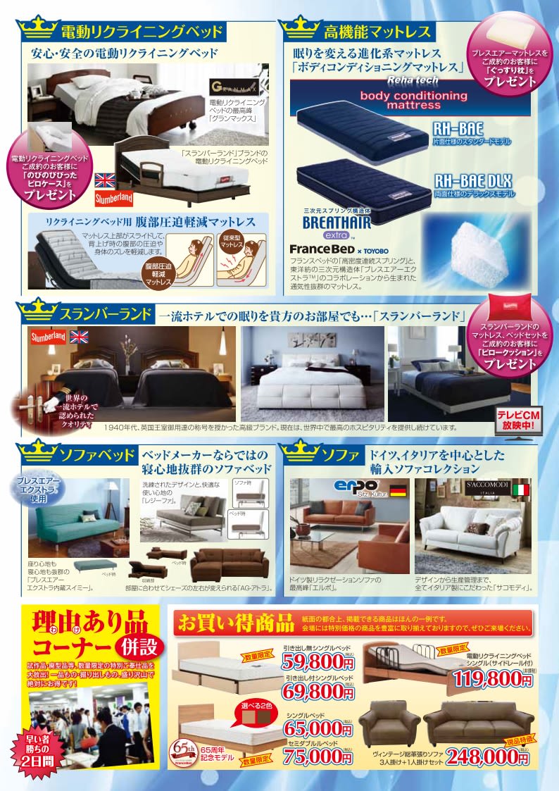 フランスベッドの展示会では特価商品から人気商品、高級商品まで幅広く展示しております。