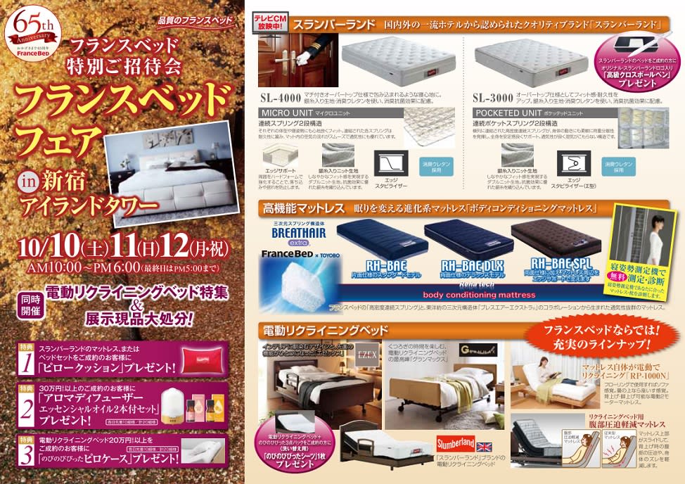 フランスベッドの人気商品からお買い得品まで幅広く展示される、お得な展示会です。