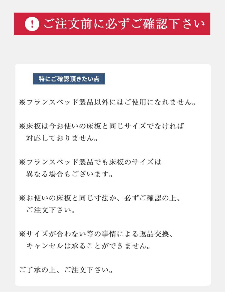 他の画像を見る 今お使いのフランスベッドの床板を交換したい方のための床板 フランスベッド 布張り床板 のみ | 正規品 フランスベッド製 床板 ベッド 床板 のみ 床板のみ 販売価格 ¥ 11,800 税込 〜 販売価格 ¥ 税込 詳細を見る お気に入りに登録する